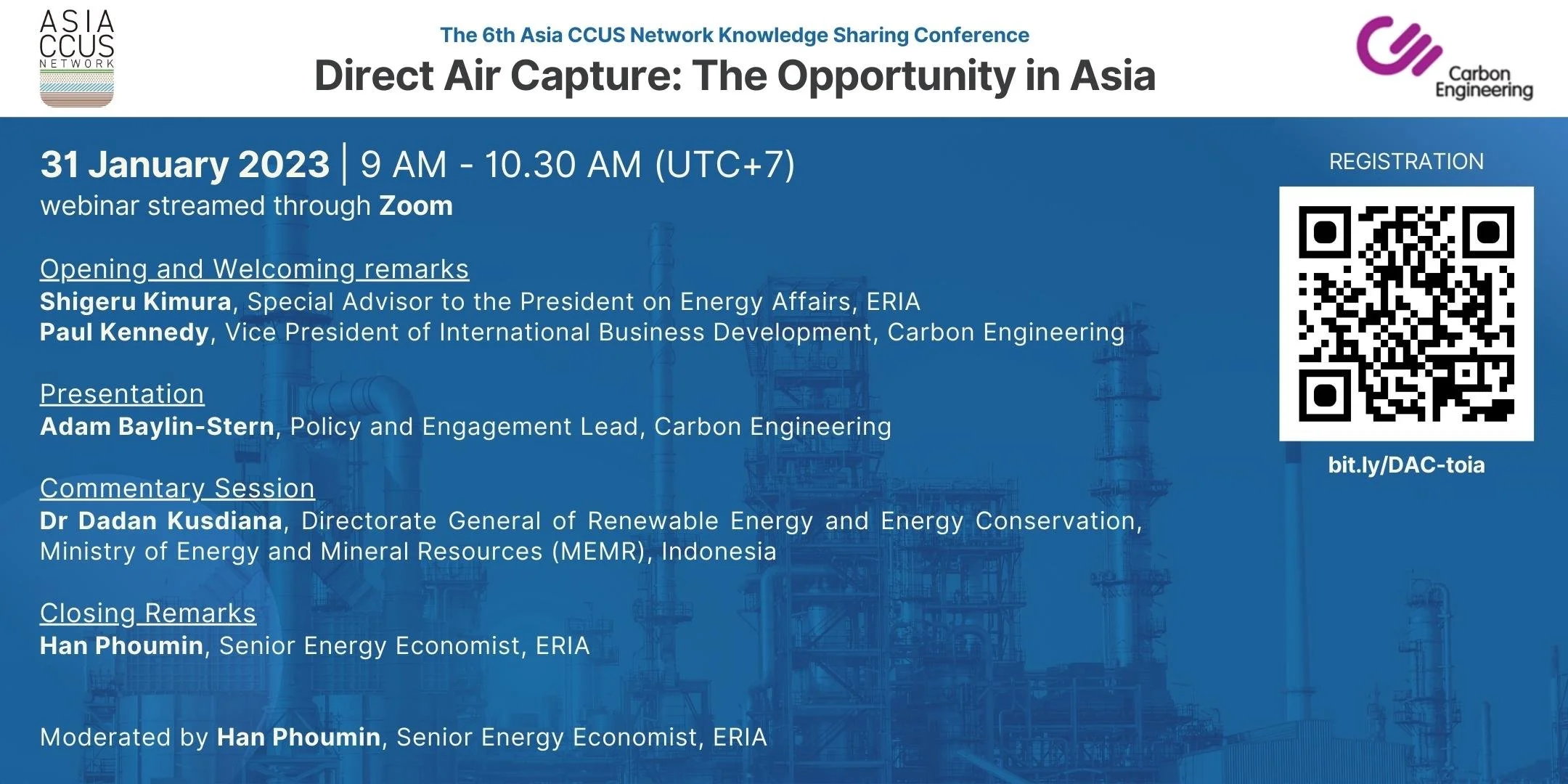 The conference will promote knowledge-sharing on the DAC technology and the policy and regulation needed to support its large-scale deployment. It is co-hosted by ACN and Carbon Engineering, a Canadian climate solutions company, which has been focused since 2009 on developing DAC technology and commercializing it globally at large-scale, working alongside local partners. It will include presentation of the company’s technology and business developments, and discussion of the opportunity that exists to deploy DAC in Asia as it accelerates its clean energy transition. The session will also explore possibilities for countries to pursue international and regional co-operation opportunities to be suppliers of high integrity CO2 removal, and to unlock associated economic and job opportunities